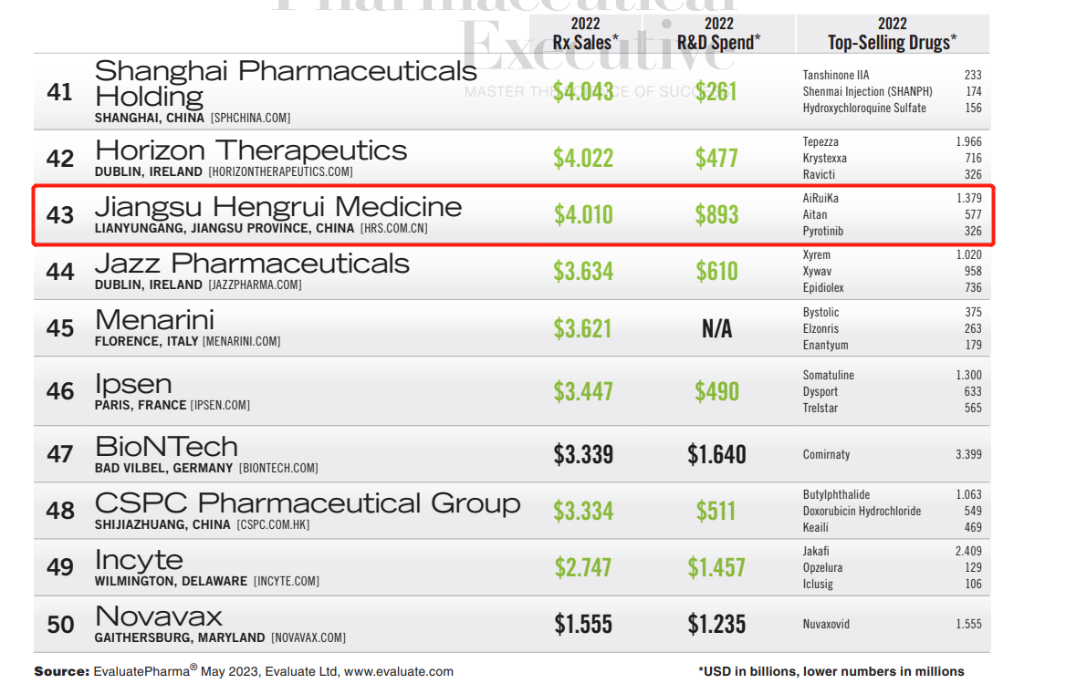 6月10日,美国《制药经理人》杂志(PharmExec)公布了2023年全球制药企业TOP50榜单,918博天堂医药连续第五年进榜,且今年榜单披露的上榜企业2022年研发投入显示,918博天堂医药以8.93亿美元位居上榜中国药企首位。